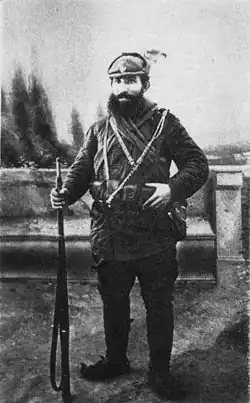 Pavle Mladenović established the first local Serb-oriented cheta (band) in Kumanovo[7] in springtime 1903 when the Internal Macedonian Revolutionary Organization (IMRO) started assassinating and murdering people who identified themselves as Serbs in the Kumanovo region.[8][9] After Mladenović, Jovan Stanojković, who had been a teacher up until then in Rudar,[10] formed a band in the Kumanovo region.[11] He adopted the nom de guerre "Jovan Dovezenski".[12] Dovezenski spontaneously decided to command his band after exarchate commander Atanas Babata massacred Serbs in his village on 11 August 1904.[10] After the establishment of bands in Kumanovo, self-organized bands were established in Skopska Crna Gora and in the Palanka kaza.[13] All of these bands had the objective of self-defense, and they worked independently from one another.[13] In the summer of 1904, resistance to the Bulgarian oppression emerged with the first Serbian-organized secret band in Drimkol, led by Đorđe Cvetković-Drimkolski from Labuništa.[13] Henceforth, the movement was coordinated.[13]