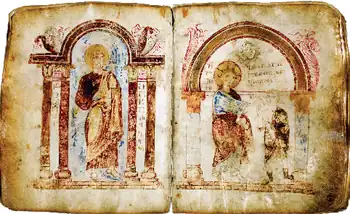 Jruchi I Gospels (Jruchi Four Gospels) is a Georgian manuscript gospel of the 10th century. It is one of the first classically illustrated Georgian manuscripts. The manuscript was copied in Shatberdi Monastery by the calligrapher Gabriel in 936.[1][2] It was painted by Tevdore Kamaratmtserali in 940.[3][4][5][2] Ekvtime Takaishvili brought the gospel from Jruchi Monastery to Tbilisi in 1919, where it would be preserved in the National Center of Manuscripts of Georgia (H-1660).[4][6][7]