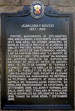 - ^ In October 2023, the National Historical Commission of the Philippines, through Resolution No. 18, corrected Luna's birth date to October 25, 1857, based on his baptismal record in Badoc Church which reportedly stated that Luna was three days old when he was baptized on October 27. It is contrary to October 23 and 24, both as per other sources and had been indicated in historical markers. NHCP cited "fallibility of memory" as Luna claimed in his 1886 marriage certificate that he was born on October 24.[1][2]