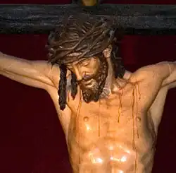 Other works were the great altars at Santa Clara in Seville and at San Miguel in Jerez, the Immaculate Conception and the realistic figure of Christ Crucified in Cristo de la Clemencìa, commissioned in 1603,[2] in the sacristy of Seville cathedral (illustration); the figure of St John the Baptist, and the St Bruno (1620); a tomb for Don Pérez de Guzmán and his wife (1619);[1] the highly realistic polychromed wood head and hands of St Ignatius of Loyola (1610) and of St Francis Xavier in the university church of Seville, where the costumed figures were used in celebrations.