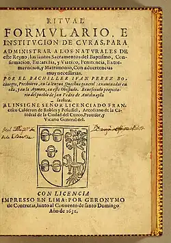 - Juan Pérez Bocanegra. Ritual, formulario, e institución de curas para administrar a los naturales de este reyno, los santos sacramentos del baptismo, confirmacion, eucaristia, y viatico, penitencia, extremauncion, y matrimonio: con aduertencias muy necessarias. Lima: Geronymo de Contreras, 1631. 720 pp. digital facsimile from the John Carter Brown Library collection at the Internet Archive.