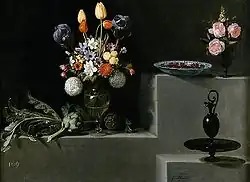 One good example of his work as a flower painter is his Offering to Flora,[3] a visual poem that parallels the lyric verse of his time, in which he united his skills as portraitist and flower painter to produce one of the most beautiful paintings of the allegory of spring. The large canvas, painted in 1627, shows the goddess of the flowers seated besides a cornucopia of spring flowers. The painting adopts a Flemish compositional type and reveals an interest in the play of light on iridescent fabrics that probably derived in the style of Juan Bautista Maino. The offering to Flora and the pair of paintings Still Life with a Vase of Flowers and a Dog and Still Life with a Vase of Flowers and a Puppy formed part of the interior decoration of Jean de Croy's palace in Madrid. Jean de Croy, conde de Solre and Diego Mexia, marqués de Leganés, were Van der Hamen's greatest patrons.
