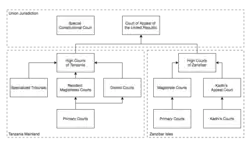 The Judiciary of Tanzania is the system of courts that interprets and applies the law in Tanzania. The current judiciary bases its foundation to the constitution of the United Republic of Tanzania of 1977.[1] Under the Constitution of Tanzania, Justices and Magistrates are independent of the government and subject only to the Constitution and the law. The country has a dual juristition system where there is a judicial structure responsible for Tanzania Mainland and another for Zanzibar. The Court of Appeal of the United Republic was established in 1979 as the final appellate judicial body with jurisdiction over the entire union.[2]