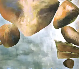 Belzer's subsequent "All That Is Solid" series (2020–22) presented a visual counterpart to the linear nature of prior work. They depict spare, loosely painted large and small boulders hanging in space against voids of misty, unnatural pastel washes, which suggested stop-action avalanches.[27] Critic David Roth deemed them nods "to 19th-century romantic landscape painting and its representations of the sublime" that balanced as comic and catastrophic metaphors for the era's shifting environmental and political ground.[27]