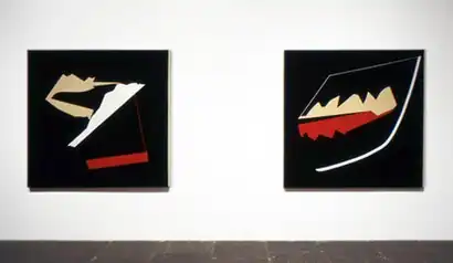Murray's early oil paintings were modestly sized, spare works in the hard-edged abstract tradition.[31][32][33] They featured irregular geometric forms in reds, opaque whites and yellows floating on sensuous black fields and explored problems of balance and stability without relying on symmetry (e.g., her "Ballast" series, 1976).[4][34][19][7] These ambiguous "figures"—compared to sails, wings, kites, moons, exotic sea creatures or decadent, even dangerous, spiky plants—derived less from the natural world than from the imagination or subconscious.[4][31][35][10] Reviewing Murray's first major solo exhibition (Parsons-Truman, 1976), SoHo Weekly News critic John Perreault described her as a "non-conformist painter" whose images suggest an open-ended but withheld logic, like signs or diagrams; the Village Voice counted her "eccentric abstractions" among the highlights of the 1979 Whitney Biennial (e.g., Red Angle and Broadway, both 1978).[4][22]