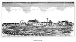 By the turn of the century, Judy's farm in Liberty Township (already known by that time as Judyville) had become an industrial village containing "six barns, one of them being the largest in Warren County, thirteen dwelling houses, a hotel, an office building and numerous outbuildings ... provided with telephonic communication, there being ten distinct lines of operation.".[3] The site being remote, Judy convinced the Chicago and Eastern Illinois Railroad to build an eight-mile-long rail line to his farm from their trunk in Vermilion County, Illinois, and also minted a limited form of currency known as "Judy Money" which was accepted both in the village and throughout the Warren County area.[4]