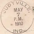 On 9 February 1903, John Judy officially platted the town of Judyville.[5] The town gained a post office on 1 October 1903, with John's son Ole Ruppert Judy as the first postmaster. It operated until 6 January 1961.[6] John married Matilda Ann Hunter on 16 December 1877 and died 12 October 1931. His home in Judyville stood for many years, but was accidentally destroyed by fire on 1 August 2001 while being remodeled.[4]