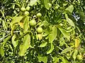 Green leaves of a walnut tree with budding walnuts, in Kashmir Valley.