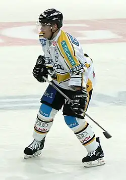 ![]() Finnish ice hockey defenceman Jukka-Pekka Laamanen of Kärpät Oulu in an away game against Ilves Tampere. | |||