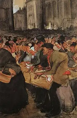 While in his early work De Bruycker adopted the gloomy, dreamy and nocturnal atmosphere he had seen in the print work of Albert Baertsoen, he did not follow the themes of Baertsoen. Baertsoen was an aristocrat who had a preference for city scenes of Ghent almost free of a human presence. De Bruycker, on the other hand, loved to include crowds of people and dramatic light effects in his graphic work.[6] De Bruycker's early etchings, dating from 1906 until the outbreak of the First World War, depict mainly four primary themes: the artist's haunts in and around the Patershol, the open-air flea markets with their rough, lowlife population, the cheap sections of the theater and some historic sites of old Ghent. He typically populated these scenes with a great number of people. His work provided an intimate view of the daily life of the economically deprived residents of his hometown. Some of his representations of the local population border on the caricatural but are never without empathy.[3]