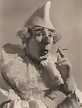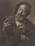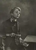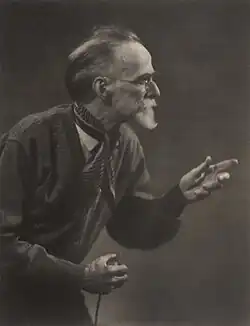 He was elected an honorary fellow of the Royal Photographic Society.[49] In his early history of the medium in Australia Jack Cato asserted that Smith "had no superior in any part of the world".[50] His portraits are in an outmoded Pictorialist style in a period of the emerging New Photography,[51][52] artistically lit with orchestrated, sometimes melodramatic, poses,[53] and printed with radical overexposure in pyrocatechin developer and bleaching-back with ferricyanide.[50] In his more contrived, but popular,[52] 'character study' tableaux the subject may be costumed as a protagonist from Dickens, Shakespeare, or from nursery rhymes.