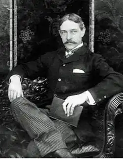Throughout the 1880s, Sir Arthur Sullivan chafed at the restrictions of the comic operas for which he was famous. His friends and associates, and even the queen, encouraged him to write a serious opera.[16] His usual collaborator, W.S. Gilbert, declined to join him in writing a full-scale romantic opera, and recommended Sturgis as "the best serious librettist of the day".[17] The opera, Ivanhoe (1891), is an adaptation of Walter Scott's long patriotic novel of the same title. Most critics praised the libretto. Bernard Shaw was an exception, accusing Sturgis of "wanton debasement of a literary masterpiece", turning "Scott's noble dialogue" into "fustian".[18][n 5] The Times praised Sturgis's "remarkable fidelity and skill".[20] The Observer also found his work skilful.[21] The Manchester Guardian said that Sullivan was fortunate in his librettist, who "show[ed] himself capable of depicting ideas and events in a few words, and those words replete with rhythmical vigour and poetic beauty as well as significance of meaning."[22] Sullivan's friend the critic Herman Klein called the libretto "a skilful and fairly dramatic adaptation of Scott's novel and a polished example of poetic lyric-writing".[23] Although the opera was a success, initially running for an unprecedented 155 performances at Richard D'Oyly Carte's new Royal English Opera House, it passed into obscurity after the opera house failed.[24] It was, Klein observed, "the strangest comingling of success and failure ever chronicled in the history of British lyric enterprise!"[23]