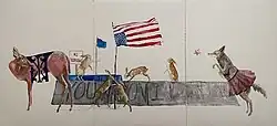 Buffalohead's art focuses on Indigenous experiences and stories, often subverting imagery of Indigenous people used in popular culture, including Disney's Pocahontas.[11][12] She often uses metaphors and allegorical images in her work to critique social issues including gun violence.[5] Her work may include whimsical imagery like tea parties and cartoon characters, Buffalohead claims that the work is intended to be unsettling.[3] Buffalohead's work also incorporates the use of anthropomorphic animals, mainly coyotes.[3][13] Buffalohead is a mixed media artist, and works with many different mediums, including oil painting and printmaking, and includes materials like birch bark and porcupine quills in her pieces.[10]