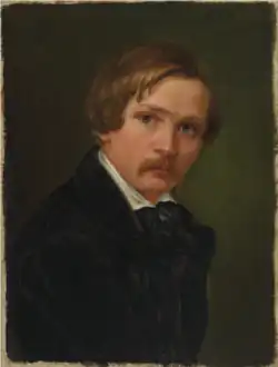 The wedding portrait of Julie Matthieu and Lewis Vieusseux was in the possession of Mrs Phyllis Gray.[33] It was painted 1849 by Auguste Chauvin (1810–1884). Born in Liege, Belgium, Chauvin taught art at the Academie Royale des Beaux-Arts de Liege from 1842, and was its director from 1855 to 1881. Julie Matthieu's parents lived in Liege in the 1840s.[37] It is probable that she was living with them, and studied with Chauvin. She advertised that she painted "after the most approved styles",[14] which were French, German and Flemish.
