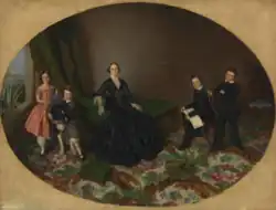 Maria Elizabeth O’Mullane and Her Children held in the National Gallery of Victoria has been attributed to both William Strutt, and also to Ludwig Becker, but this was contested in 1992 by Dr Joan Kerr.[38] Kerr attributes the work to Julie Vieussieux "on stylistic as well as associational grounds", noting the mixed French and German qualities of a very competent unsigned and undated oil portrait; she also points to Maria O’Mullane being one of the referees listed in advertisements for the Vieussieux Ladies’ School.[39]