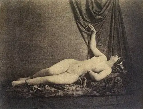 From 1842 de Villeneuve took up photography, not long after its invention, as an adjunct and aid to his graphic work,[3] producing some daguerreotypes but predominantly softly toned salted paper prints[4] from paper negatives that enabled the retouching he employed for artistic effect. Following the method of Humbert de Molard, he fixed his prints with ammonia which avoided the bleaching of highlights caused in salt prints by hypo, and thus incidentally ensured the archival permanence of his prints, which survive today.[5] He had many of his prints made by photolithographer Rose-Joseph Lemercier (1803–1887). In 1850 de Villeneuve opened a photographic studio at 18 Rue Bleue, Paris, where his subjects were 'academic studies',[6] small prints of nudes as models for artists. He printed a series of these studies as 'Etudes d’apres nature',[7] and many were published in La Lumiere, journal of the Society Francaise de la Photographie.[8] There was also a ready market for his photographs of well-known actors in full costume posing against theatrical scenery.[9]