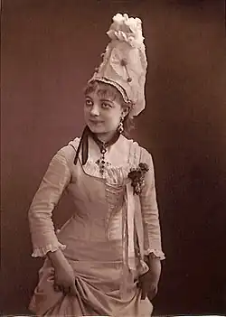 At the Folies-Dramatiques she also created roles in Beau Nicolas (1880), Les poupées de l'infante (1881), Fanfan la tulipe (1882), La princesse des Canaries (1883); moving to the Théâtre des Nouveautés she was in the premiere of La vie mondaine. On return to the Folies-Dramatiques she replaced Ugalde in Les petits mousquetaires and then created the title role in La fauvette du temple (17 November 1885). After singing with her husband in the premiere of La chatte blanche, at the Théâtre du Châtelet on 2 April 1887, she spent a year in Belgium[2] which included the premiere of Lecocq's Ali-Baba.