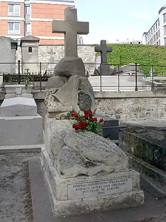 Słowacki's tombstone at Montmartre was designed by his friend and executor of his last will, painter Charles Pétiniaud-Dubos; it did not weather the passage of time well however, and in 1851 a new, similar tombstone was put in place, this one designed by Polish sculptor Władysław Oleszczyński.[1] In 1927 Słowacki's remains were moved to Wawel Cathedral in Poland, but an empty grave still remains at Montmartre.[24]