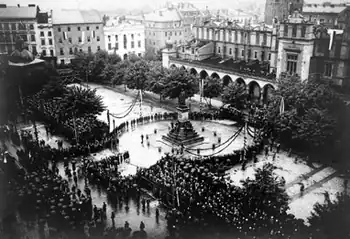 After his death, Słowacki gained a cult-like status in Poland; in particular, in the cultural center of Kraków.[1] Several obituaries and longer articles appeared in the Polish press upon Słowacki's death.[1] His works, many of them published posthumously for the first time, found growing acceptance among a new generation; an 1868 work noted that "Słowacki took the fancy of the Polish youth. He was its singer, its spiritual leader in the full meaning of the term".[33] Through undoubtedly a poet of the romantic era, he was increasingly popular among the positivists and the authors of the Young Poland period in the late 1800s and early 1900s.[26][33] His works were popularized by other writers, such as Adam Asnyk and Michał Bałucki, and his dramas were shown in theaters.[1] He became a major literary figure for the new generation of Polish writers.[1] He also became respected abroad; a 1902 English language book edited by Charles Dudley Warner noted that "the splendid exuberance of his thought and fancy ranks him among the great poets of the nineteenth century".[9]