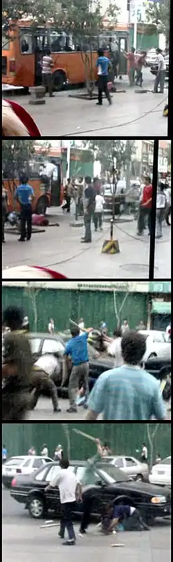![]() Rioters besieging a bus in Tianshan, Ürümqi, attacking escaping Han passengers with sticks. | ||||
