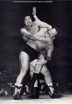 Jumbo Tsuruta (top) applies an abdominal stretch on Ron Bass (bottom), circa 1984