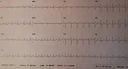 Junctional tachycardia is a form of supraventricular tachycardia characterized by involvement of the AV node.[1] It can be contrasted to atrial tachycardia. It is a tachycardia associated with the generation of impulses in a focus in the region of the atrioventricular node due to an A-V disassociation.[2] In general, the AV junction's intrinsic rate is 40-60 bpm so an accelerated junctional rhythm is from 60-100bpm and then becomes junctional tachycardia at a rate of >100 bpm.