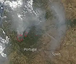 ![]() MODIS/NASA satellite image of the fires of Castanheira de Pera and Pedrógão Grande and associated smoke plumes drifting into Northern Portugal and Spain on 18 June | |