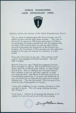 On the eve of D-Day (June 5, 1944) the order was distributed as a printed leaflet to 175,000 members of the Allied forces.[2] The order was intended to impress upon them the importance of the mission they were about to undertake.[6] At the time of the invasion Eisenhower's order was widely distributed outside of the armed forces—it was read out to 50,000 people assembled in New York's Central Park on the evening of June 6—and has been reproduced since in books and films about the war. Eisenhower himself adapted the "Great Crusade" line for the title of his 1948 book about the war Crusade in Europe.[6]