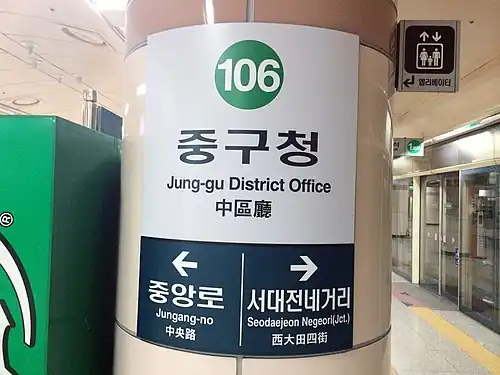 Jung-gu Office Station (Korean: 중구청역; Hanja: 中區廳驛) is a station of the Daejeon Metro Line 1 in Seonhwa-dong, Jung District, Daejeon, South Korea.