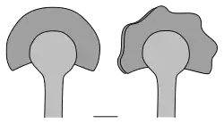 In the flattened fossils, the sporangia consist of a central, roughly circular area, on average 2 mm in diameter, smoothly connected to the end of the stem on which they were borne. Around the top and sides of the central area there is a border, around 1 mm wide, which is not connected to the stem and ends abruptly. The border varies in shape, sometimes being uniform, sometimes lobed; it appears to consist of two layers separated by a 'filling'. The layers appear separated into two 'valves' in some specimens. Cai et al. say that it is difficult to reconstruct the three-dimensional structure of a sporangium before preservation; it may have been more-or-less spherical or it may already have been compressed from side to side before being fossilized. They concluded that "[t]hese unique and somewhat bizarre sporangia ... defy our understanding", but that the most surprising feature was their complexity relative to other Silurian species such as Salopella, Cooksonia or Steganotheca.[1]