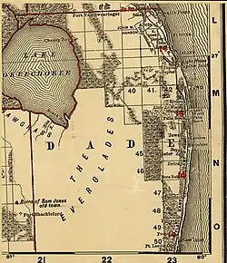 By 1888, people residing in the Lake Worth Lagoon region, including local politicians such as Elisha Newton Dimick, Alan E. Heyser, George W. Lainhart, and George W. Potter, began petitioning to move the county seat to the area from the settlements along Biscayne Bay.[1]: 20 With a larger population than the Biscayne Bay Country communities,[2] residents of the Lake Worth Lagoon region won the special election in February 1889 to move the county seat.[3] Dade County covered a vast section of southeast Florida at the time, including modern-day Miami-Dade, Broward, Palm Beach, Martin, and parts of Okeechobee counties,[4] but a small population of 995 people and just 224 dwellings according to the 1890 census.[5]: 335 While many people in the Biscayne Bay Country accepted the results, others threatened violence, causing the Lake Worth Lagoon delegation who arrived to retrieve county records to canoe through the Everglades overnight up to the New River.[2] Juno, then unnamed, likely became the county seat due to its location at the northern terminus of the Lake Worth Transportation Company steamship line.[3] Sometime between March 1889 and January 1890, residents selected the name Juno, the wife of the Roman god Jupiter.[1]: 28–29