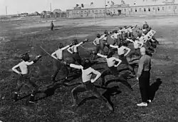 Jurgis Jungmeisteris was born on 30 October 1884 in the Pasuosis manor. Jungmeisters attended the Main Gymnastics and Fencing School of St. Petersburg. During the First World War, Jungmeisteris earned the rank of rotmistr within the Russian Imperial Army. Jungmeisteris began his service in the Lithuanian Army by joining the 2nd Uhlan Regiment. In 1923, due to speaking the Lithuanian language poorly, Jungmeisteris was moved to the reserve. After improving his ability to speak the language, in 1924 Jungmeisteris began working as a fencing, rowing, and swimming instructor at the physical education center of the Higher Officers' Courses.[1] That same year, in autumn, fencing as a sport was introduced into the physical training program of the Lithuanian military.[2] The standard training programme was four months long. Later, fencing was included in the programme of the War School of Kaunas.[3] Jungmeisteris also lectured at the State Theater School of Acting.[4]