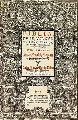 The original title of Damatin's translation was Bibilija, tu je vse svetu pismu stariga inu noviga testamenta, slovenski tolmačena skuzi Jurija Dalmatina[7] (The Bible: That Is, the Entire Holy Scripture of the Old and the New Testament, Translated into Slovene by Jurij Dalmatin), and it was published in 1583, printed in the Bohorič alphabet. The translation set the norm for the Slovene standard language (with later innovations in vocabulary) until the first half of the 19th century.[8]