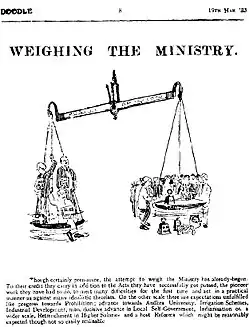 I was a Minister of Development without the forests. I was a Minister of Agriculture minus Irrigation. As a Minister of Agriculture I had nothing to do with the Madras Agriculturists Loan Act or the Madras Land Improvement Loans Act... The efficacy and efficiency of a Minister of Agriculture without having anything to do with irrigation, agricultural loans, land improvement loans and famine relief, may better be imagined than described. Then again, I was Minister of Industries without factories, boilers, electricity and water power, mines or labor, all of which are reserved subjects.[26]