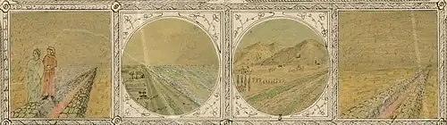 Just as his wife Anthonie Wirix had a fascination with Dante's oeuvre. Inspired by the illustrations in Jacob van Maerlant's 'Rhyme Bible' (1271), Anthonie made as many as 670 coloured miniatures for the 34 cantos of 'The Inferno' section of Dante's epic poem The divine Comedy (La divina Commedia). These pen drawings, which he probably meant to publish, are part of the archives of the family of the mentioned great-grandfather Hoek. The 28 pen drawings illustrating Dante's Vita Nuova in the Wirix-van Mansvelt collection at the National Library of the Netherlands are most probably by the hand of Wirix too. Artisticity may have been a Wirix family feature, because Anthonie's sister Victoire Leonhardt-Wirix (1875–1938) was an artist with a lifelong passion for painting and drawing. Examples of Antonie's miniatures below illustrate the first three segments of canto XV of The divine Comedy. Dante (in red) and his guide Virgil walk along the banks of an infernal water stream and in the canto a comparison between Flemish and Italian water defences is made.