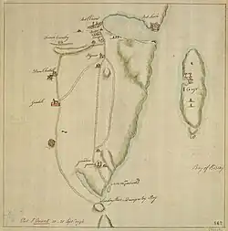 The fleet left Plymouth on 14 September 1746, and five days later the troops disembarked at Quimperley Bay, 10 mi (16 km) from L'Orient, and were marched in two columns to the point of attack. St. Clair sent Thomas Armstrong and Justly Watson to reconnoitre the town, and they reported that the place was only defended by a thin loopholed wall without any ditch. They added that they had chosen a site for a battery, from whence they could either make a breach or burn the town in twenty-four hours. In the early morning of the 22nd, St. Clair made his own reconnaissance, accompanied by Armstrong and Watson, who repeated their earlier views. A council of war was held on board the Princessa, the flagship of Admiral Lestock, at which the two engineers and Captain Chalmers, of the artillery, were present. These three officers being of one mind, it was decided to make the attempt, and the orders were given. The result proved that they were in error in their views. Without a proper strength of artillery, and with insufficient ammunition and stores, they fired away almost all their shot without causing any real damage to the works.[8] Several councils were held, and after much disputation it was ultimately decided that the engineers had made a wrong calculation, that the men were greatly fatigued, and that the prospects of success were not good enough to continue. The siege was therefore abandoned on 27 September, and on the next day the men were re-embarked.[8]