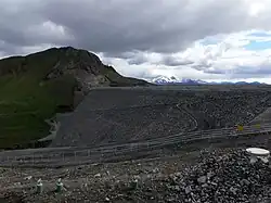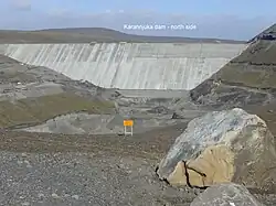 The Kárahnjúkar Dam[1] (Icelandic: Kárahnjúkastífla [ˈkʰauːraˌn̥juːkaˌstipla])[2] is the centrepiece of the five dams and the largest of its type in Europe, standing 193 metres (633 ft) tall with a length of 730 metres (2,400 ft) and comprising 8.5 million cubic metres (300×106 cu ft) of material.