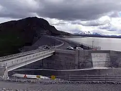 Kárahnjúkar Hydropower Plant (Icelandic: Kárahnjúkavirkjun [ˈkʰauːraˌn̥juːkaˌvɪr̥cʏn]), officially called Fljótsdalur Power Station[1] (Icelandic: Fljótsdalsstöð [ˈfljoutsˌtalsˌstœːθ])[2] is a hydroelectric power plant in Fljótsdalshérað municipality in eastern Iceland, designed to produce 4,600 gigawatt-hours (17,000 TJ) annually for Alcoa's Fjarðaál aluminum smelter 75 kilometres (47 mi) to the east in Reyðarfjörður. With the installed capacity of 690 megawatts (930,000 hp), the plant is the largest power plant in Iceland. The project, named after the nearby Kárahnjúkar mountains, involves damming the rivers Jökulsá á Dal and Jökulsá í Fljótsdal with five dams, creating three reservoirs. Water from the reservoirs is diverted through 73 kilometres (45 mi) of underground water tunnels and down a 420-metre (1,380 ft) vertical penstock towards a single underground power station. The smelter became fully operational in 2008 and the hydropower project was completed in 2009.[3]