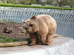 Next to the south entrance to the park is the Bärenzwinger (bear pit). This was built in 1938–39 on the site of a former sanitation depot, also designed by Ludwig Hoffmann and already decorated with more than 50 plaques by Otto Lessing depicting bears.[20][21] It consists of indoor sleeping quarters and outdoor exercise areas which have held as many as five bears (the armorial animal of Berlin) who are the official bears or mascots of the city.[22][23] The impetus for building the Bärenzwinger was a letter to the newspaper Berliner Zeitung am Mittag (now B.Z.) from Wilfried Bade which appeared the day after the end of the celebration of the city's 700-year anniversary. The Lord Mayor, Julius Lippert, saw to its completion despite objections from some Nazi functionaries that there were more important things to be done in what proved to be the run-up to World War II.[24] Two of the original bears were gifts from Bern, which also has a bear on its arms.[25][26] It remains largely unchanged, although it had to be reconstructed after the war; it reopened in 1949 with two new bears, again from Bern; one of these, Jente, produced 33 cubs (including 4 sets of triplets and 9 pairs of twins) before being retired to the zoo.[26][27][28] The last official city bear, Schnute, lived there until her death in 2015;[29] her daughter Maxi also lived there until her death in August 2013.[2][30][31][32] The Bärenzwinger is a listed Berlin landmark.[33] It was threatened with closure in 1990 due to lack of funds for needed modernisation, but after public protest, the Berlin Senate funded the project. Underfloor heating in the cages and a skylight dome were added, and the electricity supply was overhauled. The facility reopened in 1993[34] and celebrated its 70th anniversary in 2009.[35] Some animal protection advocates, including the city's own animal protection officer, have called for it to be closed as old-fashioned and inhumane.[32][36][37][38]