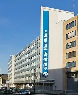 The Kölnische Rundschau is a regional, independent daily newspaper for the Cologne/Bonn area. It is edited by Cologne Heinen-Verlag, which has its own independent local editorial office. The production of the national section was taken over by the Bonn General-Anzeiger during the first quarter of 2010.[1][2] In the first quarter of 2018, the joint edition with the Kölner Stadt-Anzeiger sold 251,994 copies, a loss of 40% since 1999.