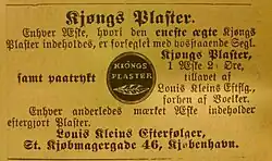 Seidelin's business was sold to Louis Klein in around 1840. Klein was the son of master baker Louis Klein Sr., whose property (home and bakery) was located just a few houses down the street at No. 62.[7] Klein had recently married Emilie Klein. After the death of her father, possibly by suicide, follow the fire of his property Dalsborg in Snekkersten, she had been raised by her aunt and uncle in Køng. The uncle Christian Gottfried Voelker was manager of Køng Textile Factory. He had also produced the so-called Køng Plaster, a very popular remedy for treating wounds (prepared from red lead, olive oil and camphor). The right to produce this paste had, following his death, been passed down to Emilie Køhlert. She had prior to the wedding produced Køng Plaster in her home at the corner of Kompagnistræde and Badstuestræde (No. 62, now Kompagnistræde 8). It was the sale of Køng Plaster that enabled Klein to buy Seidelin's business since it was used for paying the installments on the property.[8]