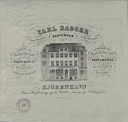 The ground floor of the building was adapted for use as a proper retail space with large display windows in 1952.[1] Carl Bagger's perfumery was at some point replaced by Hugo Vilsoët Material- Drogueri- Parfume- og Farvehandel, a combined pharmacy, perfumery and dye shop.