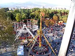 Kültürpark, which is surrounded by walls, has five entrance gates: Lozan Gate, Montrö Gate, 9 Eylül Gate, Cumhuriyet Gate, and 26 Ağustos Gate.[5] (The first two refer to two international treaties, namely the Treaty of Lausanne and the Montreux Convention respectively, the third refers to the date of the liberation of İzmir, the forth means Republic, and the last refers to the start date of the Battle of Dumlupınar, the last battle of the Turkish War of Independence.) Some of the facilities in the park are fourteen indoor exhibition halls, four conference halls, Atatürk Open Air Theater, İsmet İnönü Art Center, İzmir Sanat, a marriage office, Celal Atik Sport Hall, an amusement park, a parachute tower, Youth Theater, a museum, a 1,850-metre long running track, a swimming pool, tennis courts, and a football pitch. There are 7,709 trees across the park.[16] All plants were tagged and trees were insured.[17][18]