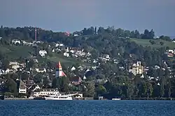 The so-called Dorfbach stream is also one of the most important spawning grounds for lake trout, although the number of spawning animals was as of 2013 very modest.[3] Some glacial erratics respectively the so-called Findlingsgarten at the lower end of the gorge towards Küsnacht, as well as the idyllic landscape, are further points of attraction. Towards Küsnacht there is the local historical museum and the historical core of Küsnacht. The museum is a former historical mill, located at the southern entrance of the ravine. The early medieval Zehntenhaus granary on the lake shore is another attraction to be mentioned.[2]