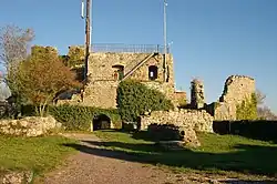 The hill castle is one of the most important historic buildings on the High Rhine and a landmark of the county of Waldshut. It was probably constructed between 1125 and 1141. The present ruins were owned inter alia by the counts of Küssenberg, the Bishopric of Constance and the counts of Sulz. The castle, which was later developed into a fortress, was destroyed by a fire started by its garrison on 8 March 1634 when the Swedish Army approached it during the Thirty Years' War and by a landslide on 25 December 1664. In the 19th century work began on uncovering the ruins which have since become a popular destination in the region.[1]