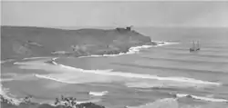 The second, also 3 miles (5 km) long line led from the sugar mill to Kahili Landing, where the packaged, ground sugar was loaded onto the steamers anchored at Mo'ko'lea Point using a wire rope winch.[1] It started halfway on Kilauea Road, then northwards and eastwards to Makanaano Square and ended at Kahili Landing above Mo'ko'lea Point. There the ships anchored to be loaded with 125 pounds (57 kg) sugar bags each.[3] The operations at Kahili Landing and on the railway line leading there were abandoned in 1928, whereupon the sugar was transported from the sugar mill to Ahukini Landing for shipment.