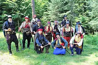 The kırcalı or kirdzhali (Turkish: kırcalı, from Ottoman Turkish: قیر, romanized: kır meaning "mountain", Bulgarian: кърджалии, Serbian: крџалије, krdžalije) is a term used for a type of bandits, brigands and rebels active in the Balkans at the end of the 18th- and beginning of 19th century, in the prelude of national revolutions and liberation of Bulgarians, Greeks and Serbs.[1] According to some the name is derived from the town of Kardzhali in the Rhodopes, one of the important retreats of "mountain bandits" (dağlı eşkıyası) that emerged after the Ottoman Empire lost territory by the Black Sea and made Rumelia a borderland filled with refugees and former frontiersmen.[1] The kırcalı was a new type of banditry that was registered from 1785, denoting outlaws that were mostly professional soldiers, but had local Muslims and non-Muslims in their ranks.[2] They differed from brigands who robbed on the highway, and instead plundered and destroyed villages, towns and cities, indiscriminately killing.[2] They were directed against the political order and were involved in the ayan infighting and rebellions against the Porte.[2] The Porte also used the kırcalı in war-time, sanctioning violence against Christians.[1]