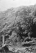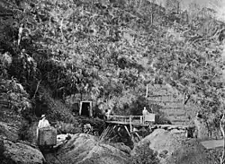 The mine consisted of several vertical shafts and horizontal tunnels, also known as adits or drives, down the hill side. It is still possible to explore some of these drives. One of them runs 50 m into the mountain, ending at a filled-in shaft. In front of the mine is a flat strip of ground, where mining railway used to run.[12] More than 2760 ounces of gold have been extracted by January 1893, after implementing the Cassel cyanide process,[13] by which the level of gold recoverable was increased from 55% to 95%.[14] Official production data by the Thames Mines show a yield of 2,327,619 oz bullion with a value of NZ$845 mio.[6]