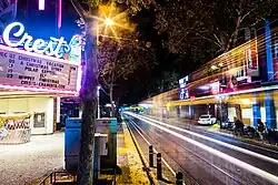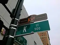 The path of the street roughly (but not exactly) follows the line from Old Sacramento to Sutter's Fort, which existed as a trail before Sacramento was founded.[1] K Street was once a continuous street for automobile traffic in the mid-20th century during its heyday as a major shopping destination. Department and other large stores that once lined K Street included Breuner's, Weinstock's, Hale's, S. H. Kress & Co., Roos/Atkins, Montgomery Ward and Sears. Movie theaters included the Crest, the Senator, the Hippodrome and, nearby, the Alhambra. In 1969, K Street in downtown Sacramento was closed to all automobile traffic permanently, as it was converted into a pedestrian mall that evolved into the modern K Street Mall. In 1987, Sacramento Regional Transit opened their light rail system, with tracks running on K Street between 7th and 12th Streets. On November 12, 2011, K Street between 8th and 12th Streets was opened to automobile traffic for the first time in 42 years.[2] In November 2012, the K Street Mall was rebranded "The Kay", and now functions as a shopping area.[3] In May 2014, the Sacramento city council approved a public subsidy deal to build a downtown arena. The re-use of the failing Downtown Plaza shopping mall was seen as a possible catalyst to bring revenue and people to Downtown. Today, much of K Street is undergoing re-development, with many businesses still active.