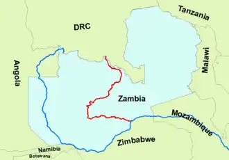 The 1,576 kilometres (979 mi) long Kafue River is the longest river lying wholly within Zambia.[1] Its water is used for irrigation and for generating hydroelectric power.[2] It is the largest tributary of the Zambezi,[3] and of Zambia's principal rivers, it is the most central and the most urban. More than 50% of Zambia's population live in the Kafue River Basin and of these around 65% are urban.[1]